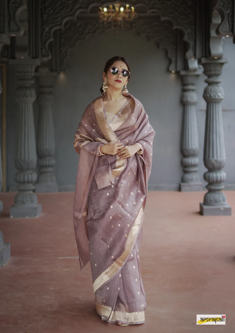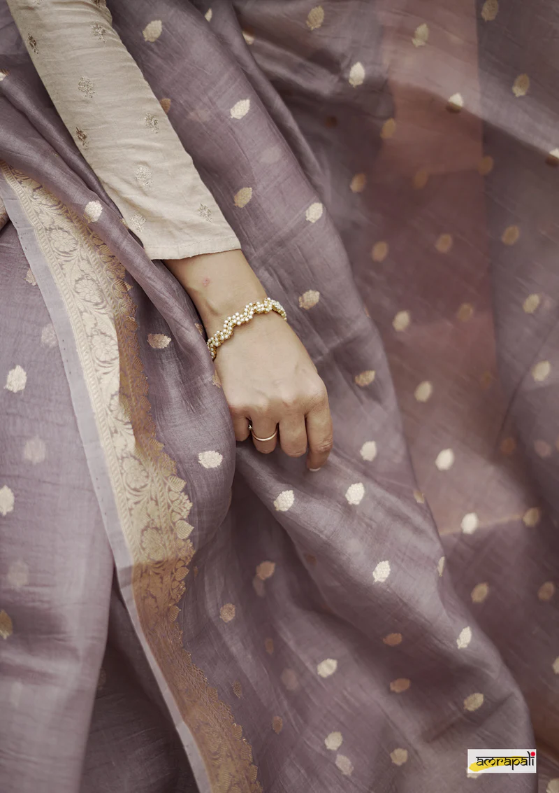 Indulge in the handwoven, timeless grace of organza silk banarasi, embellished with delicate golden zari floral butas and intricately woven palla, edged with a detailed zari border.